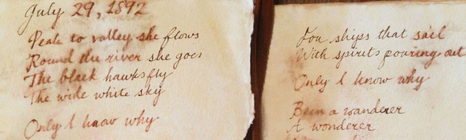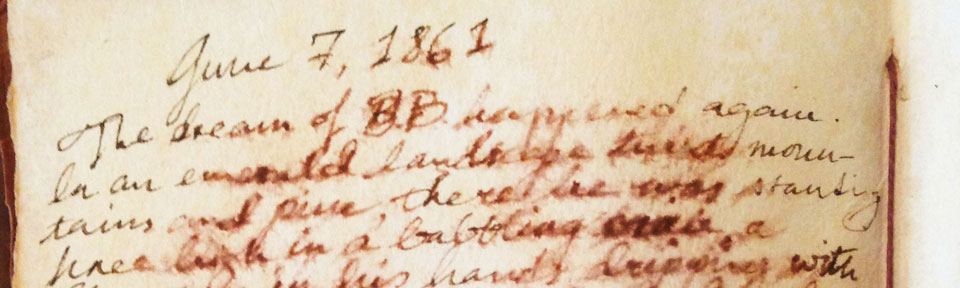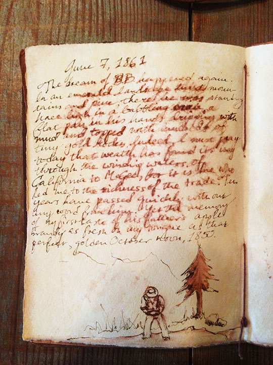 The dream of B.B. happened again. In an emerald landscape (twixt) mountains and pine, there he was standing knee high in a babbling (crick), a flat pan in his hands dripping with mud and topped with (hundreds) of tiny gold rocks. Indeed, I must pray today that wealth has found its way through the winding waters of California to McGee, for it is he who led me to the richness of the trade. Ten years have passed quickly without any word from him. Yet the memory of my first taste of his father’s apple brandy as fresh on my tongue as that perfect, golden October noon, 1850.