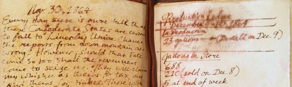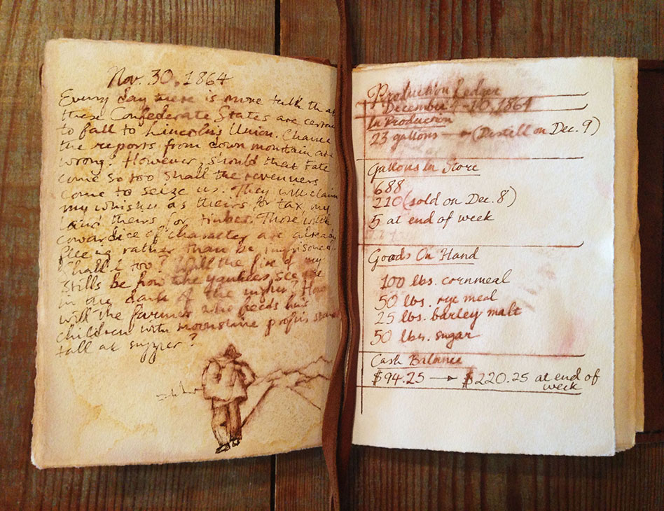 Every day there is more talk that these Confederate States are certain to fall to Lincoln’s Union. Chance the reports from down mountain are wrong. However, should that Fate come so too shall the revenuers come to seize us. They will claim my whisky as theirs for tax, my land theirs for lumber. Those with cowardice of character are already fleeing rather than be imprisoned. Should I too? Will the fire of my stills be how the yankees see me in the dark of (the night)? How will the farmer who feeds his children with moonshine profits (stand) tall at supper?.