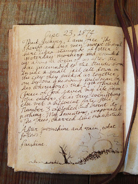 Thank Heaven, I am free. The Sheriff and his men swept through here like a stampede of steer yesterday morning and rounded up about a dozen of us after the fire succumbed to the thunderstorm. Inside a small jail cell down in the city they packed us together, one by one questioning each man on his whereabouts the 19th. [Through…] Grace of God saved my life from the embers. It is true everything else met a different fate. Still Number 3 exploded and burnt to nothing. My Inventory, evaporated. The Trees, charred like matchsticks.